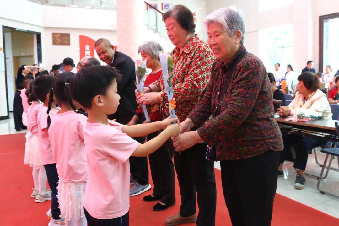 表演落幕,温馨的献花环节随即展开。小朋友们手捧精心准备的鲜花,在老师的引导下有序走到老人面前,踮起脚尖将鲜花递出,用软糯的童音说道:“爷爷奶奶,重阳节快乐!”。花香与笑声在空气中交织,成为秋日里最温暖的风景。