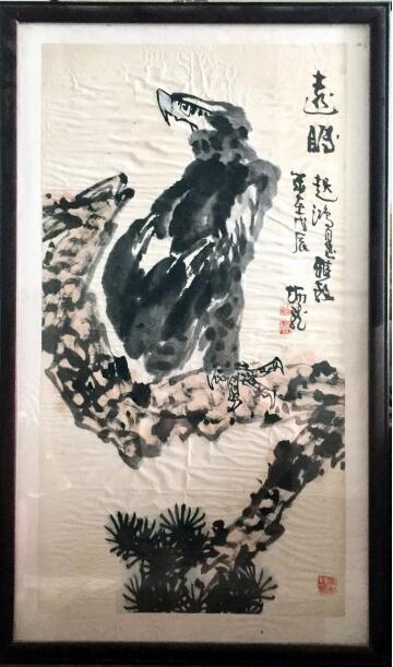 4、1988年,王怀成先生邀济南画院张登堂、王炳龙、闫学曾先生笔会,王炳龙先生现场写“远瞩”(图3)贻我。从“远嘱”和“松鹤”中的“松”,可窥原作与手帕成品的变化。