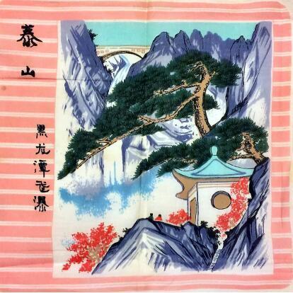 2、1997年《济南市志(3)》:济南手帕厂“生产的泰山、黑龙潭瀑布印花手帕,1980年全国手帕实物质量评比中被评为优秀产品。”我存有一《济南手帕厂·印染工艺卡》,其封面写有“8板太(泰)山”“81.12.18”,其内有两条手帕(规格26×26厘米):“泰山·黑龙潭飞瀑”(图2)“泰山·远眺南天门”。疑《济南市志(3)》所说“被评为优秀产品”的“泰山、黑龙潭瀑布印花手帕”,即“泰山·黑龙潭飞瀑”。此卡为王子源先生所赠。