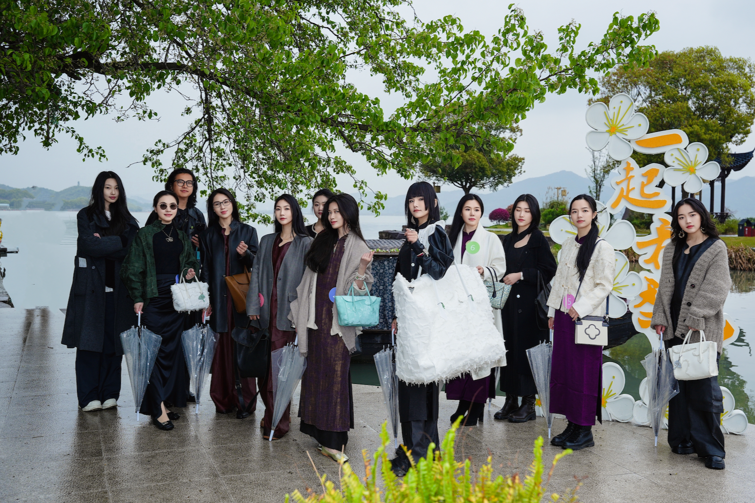 活动当日,10位从市民中招募的素人模特,在专业的模特老师指导下,手持抱缺原创包包,打着透明雨伞,在钱湖烟雨这个最浪漫的场景里款款而行。这些包包还分别悬挂着以东钱湖在地文化为灵感的梨花树挂件和萤火虫挂件,表达着东钱湖原生态和松弛休闲的景区特色。“我们想让每一件单品都成为东钱湖故事的载体。”抱缺美学空间主理人张国君如是说。