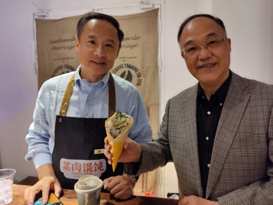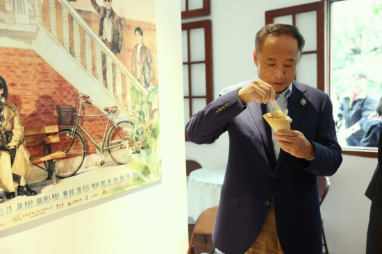 “周老师的店长做得很专业。”徐晨是周野芒的影迷,听说“菜肉馄饨·思南会客厅”开张,他早早预约过来等候店长上班。咖啡已经买过,又买了份特制的馄饨甜品,一只菜肉馄饨装在精致的蛋筒里。“我出生于1957年,比周老师小一岁,我们都是老上海。”从周野芒手里接过馄饨,他来不及吃,又拿起手机继续拍照。“周老师的作品我大都看过,最早是看央视版的《水浒传》,他在里面演林冲演得真好,当时演员表里就叫野芒。”对于《菜肉馄饨》,徐晨期待已久,已经在朋友圈做起电影的“自来水”,“看到这个名字,我就想看了。上海人就好这一口——菜肉馄饨。小辰光,石库门里一家包,全栋送。这些事情都是我们从小亲历的,海派电影很有趣的,希望能多拍一拍。”