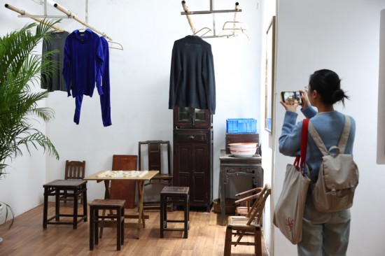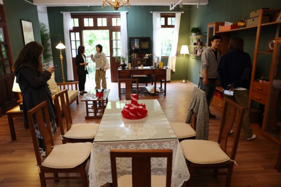 楼下买咖啡,楼上可以参观“老汪”的家。老式沙发、桌椅上堆满有生活气息的老物件,不少来自电影中的原道具,“门口”停着一辆自行车,那是电影里老汪骑着去复兴路菜场买菜用的,车筐里的帆布袋也是片中用过的,里面放了当天新买的蔬菜。一张摆着毛笔、宣纸的写字台是老汪日常练书法的地方,“接下来我们会在这里做一个互动区”,《菜肉馄饨》制片人顾晓东介绍,剧组会制作两枚“菜肉馄饨”的印章,会写毛笔字的观众可以在这里写下自己的“墨宝”,盖上印章带回家。墙边的储物柜里还会摆上蜂花牌檀香皂,观众可以拿起来,闻一闻,感受一下影片里素娟的最爱。