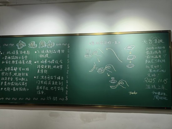 “场景内摆设会持续更新,欢迎常来常新”。黑板上写着“参观须知”、当日天气预报,以及名为《菜肉馄饨的一生》的有趣简笔画。作者Tango是上海知名漫画家,他也出现在片尾彩蛋里。未来,这里的黑板报会经常更换,还会留一块区域给市民自己创作。
