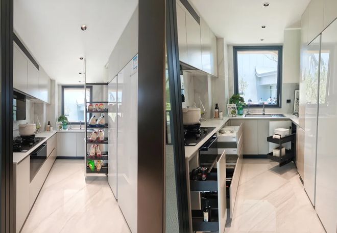 ④加载五金升级、调味拉篮、锅具拉篮,800碗碟三层拉篮,餐厅零食拉篮柜等;容量节省了约250L,相当于5.7个20寸登机箱,极致的收纳。⑤大手笔的在厨房设计了制冷空调,相比只能吹风的凉霸而言,这样的设计更美观也更舒适。